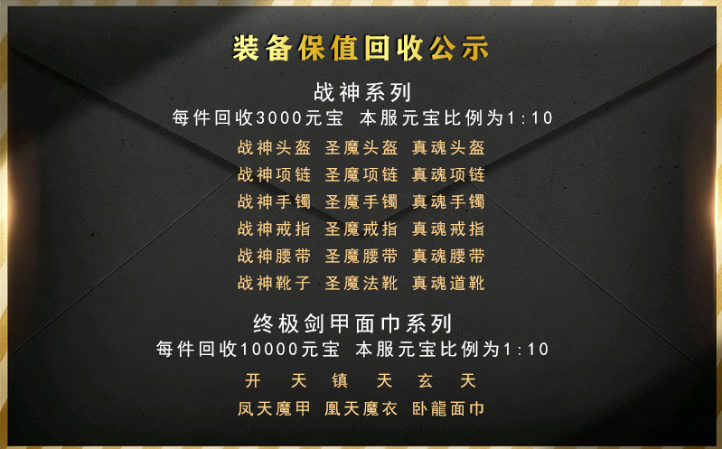 装备依次为:沃玛、祖玛、赤月、雷霆、强化雷霆、战神。开天系列终极。
